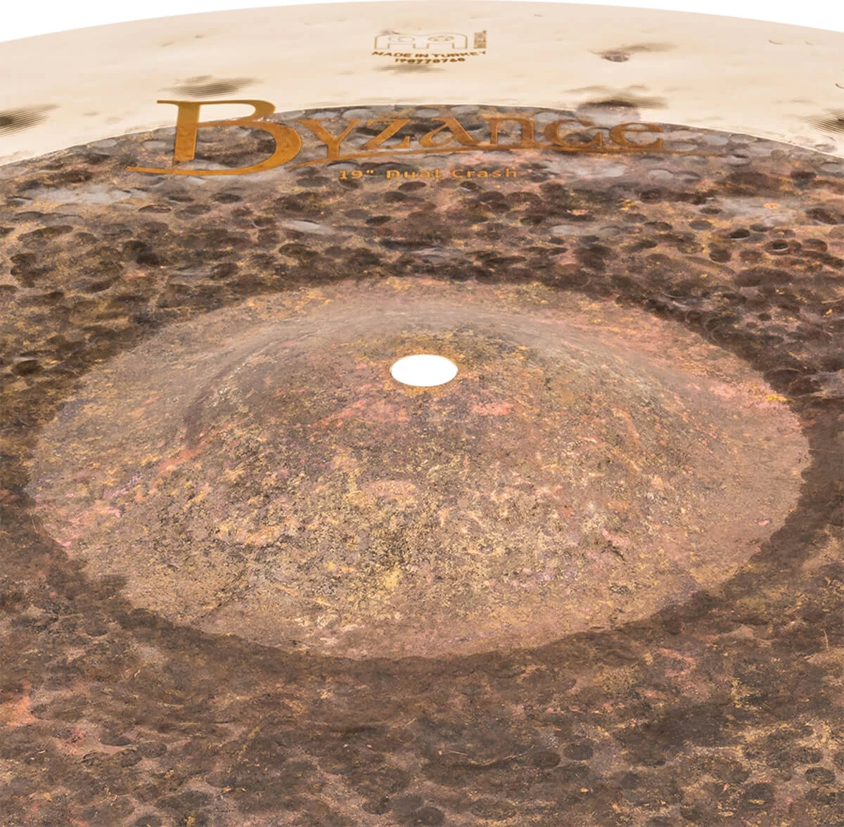 Der aufregende Kontrast des trockenen und des brillianten Finish, erzeugt durch eine einzigartige Kombination aus Hämmerung und Abdrehen, erzeugt beim Meinl Byzance Extra Dry Dual Crash die zwei unterschiedlichen Spielzonen für Ride- und Crash-Spiel.