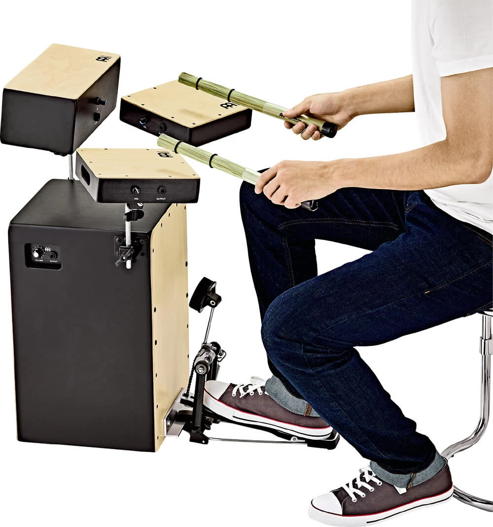 Das MEINL Cocktail Cajon Kit bietet dem Spieler eine breite Soundpalette: von Bass- und Snare- über Bongo- bis hin zu einem Tom-Sound, alle Instrumente im Holz-Cajon-Stil. Im Mittelpunkt dieses Kits steht die MEINL Cocktail Cajon, die als Kickdrum gespielt wird. Die mitgelieferte MEINL Pickup Snare, die Pickup Bongo-Cajon (hoher und tiefer Sound) und das Pickup Tom Tap lassen sich auf dem Kit montieren und ergeben zusammen einen vollen Cajon-Set-Sound. Jedes dieser drei Add-ons beinhaltet einen eigenen L-Rod, der mit den standardmäßigen Ringschraubenhalterungen an der Cajon befestigt wird. Zusätzlich zu den Cajon-Trommeln wird dieses Kit mit einem Fußpedal und einem weichen Schaumstoff Cajon Beater sowie speziellen Husk Brushes geliefert. Die Brushes liefern einen weichen, aber dennoch präzisen, perkussiven Klang. Jede Trommel im Cocktail Cajon Kit ist mit einem eigenen Piezo-Pickup und einer hochwertigen Ausgangsbuchse (Klinke) ausgestattet, sodass Sie das gesamte Set anschließen und die Lautstärke selektiv erhöhen können, wenn zusätzliche Verstärkung benötigt wird (Audiokabel nicht im Lieferumfang enthalten).