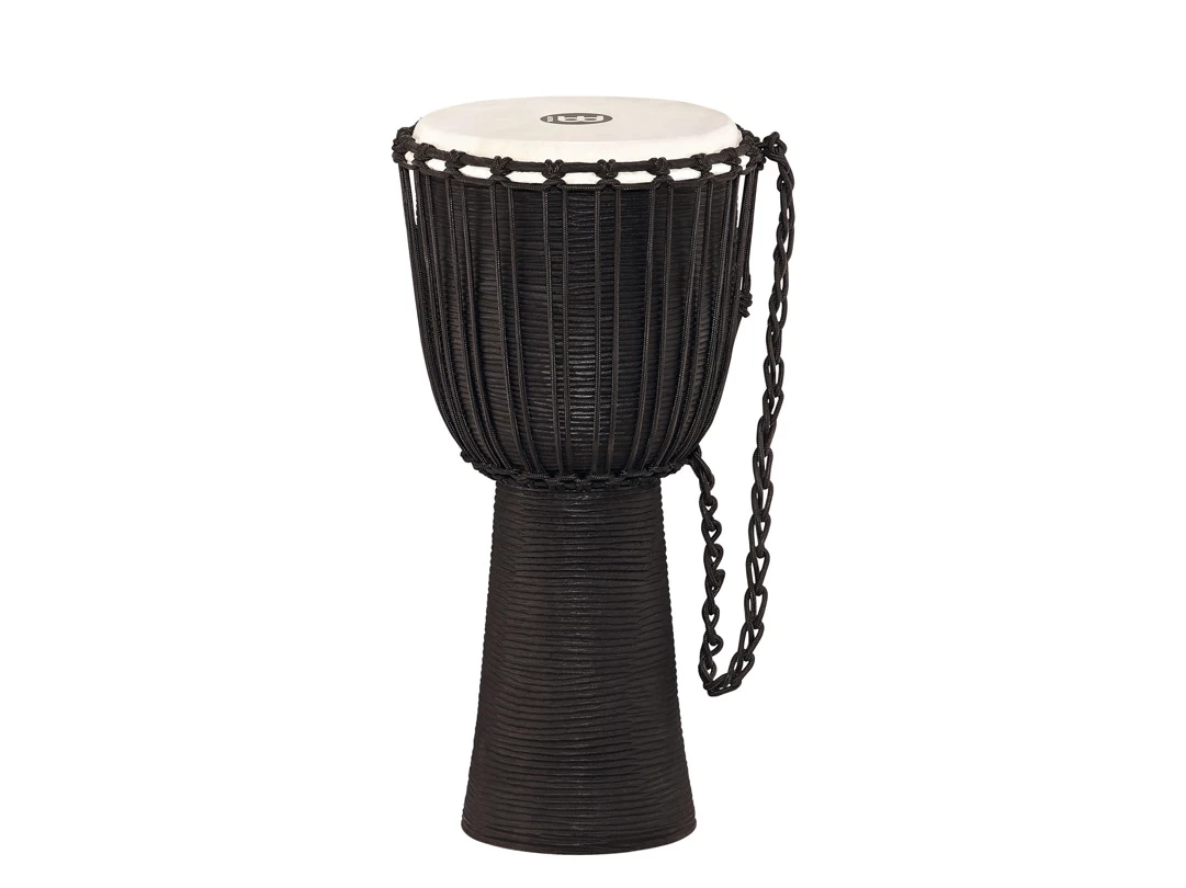 Die Meinl HDJ3 Djemben werden aus einem massiven Stück Plantagen-Mahagoni handgeschnitzt und haben ein horizontales Streifenmuster, das an einen Fluss erinnern soll. Diese Riffelung erleichtert zudem das Halten dieser Rope Tuned Headliner Serie Djemben zwischen den Knien.